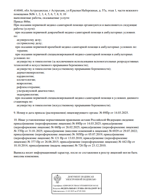 Проводит амбулаторный прием пациентов, лечение ЗППП, ведение беременности, кольпоскопические исследования шейки матки, индивидуальный подбор контрацепции, аппаратное лечение недержание мочи на лазере, лазерный лифтинг интимных зон.